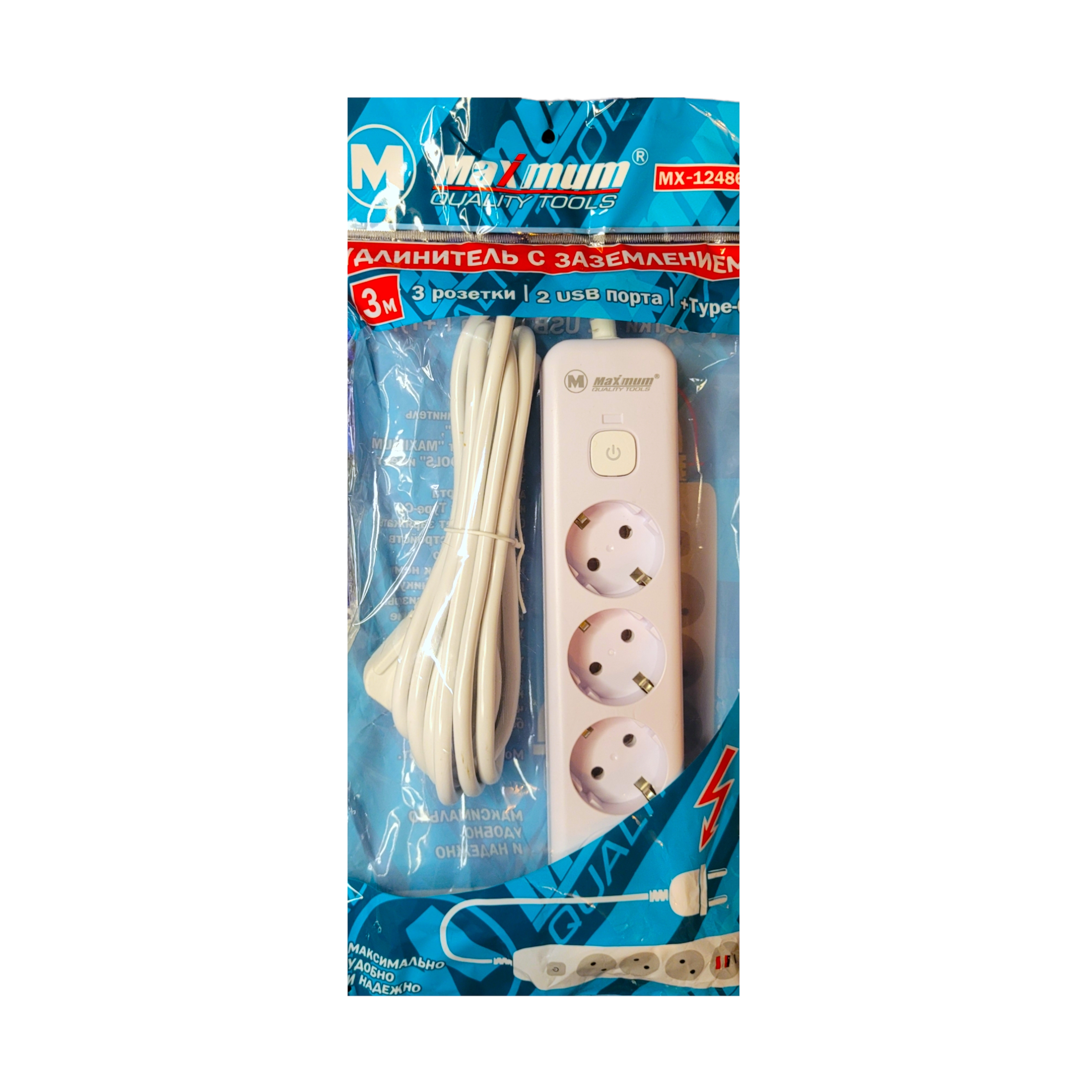 Удлинитель с заземлением 2 м, плоский, 3 розетки EU_UK_US, 5 USB портов,Type C,T05, "MAXIMUM" MX 148