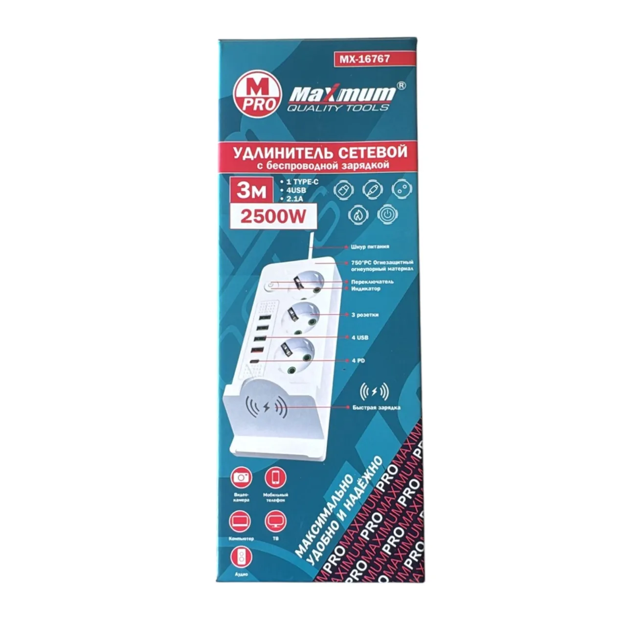 Белый сетевой фильтр с беспроводной зарядкой на 3 метра от "Maximum Quality Tools" оборудован тремя розетками евро типа с заземлением, а также 4 USB портами и входом Type C.