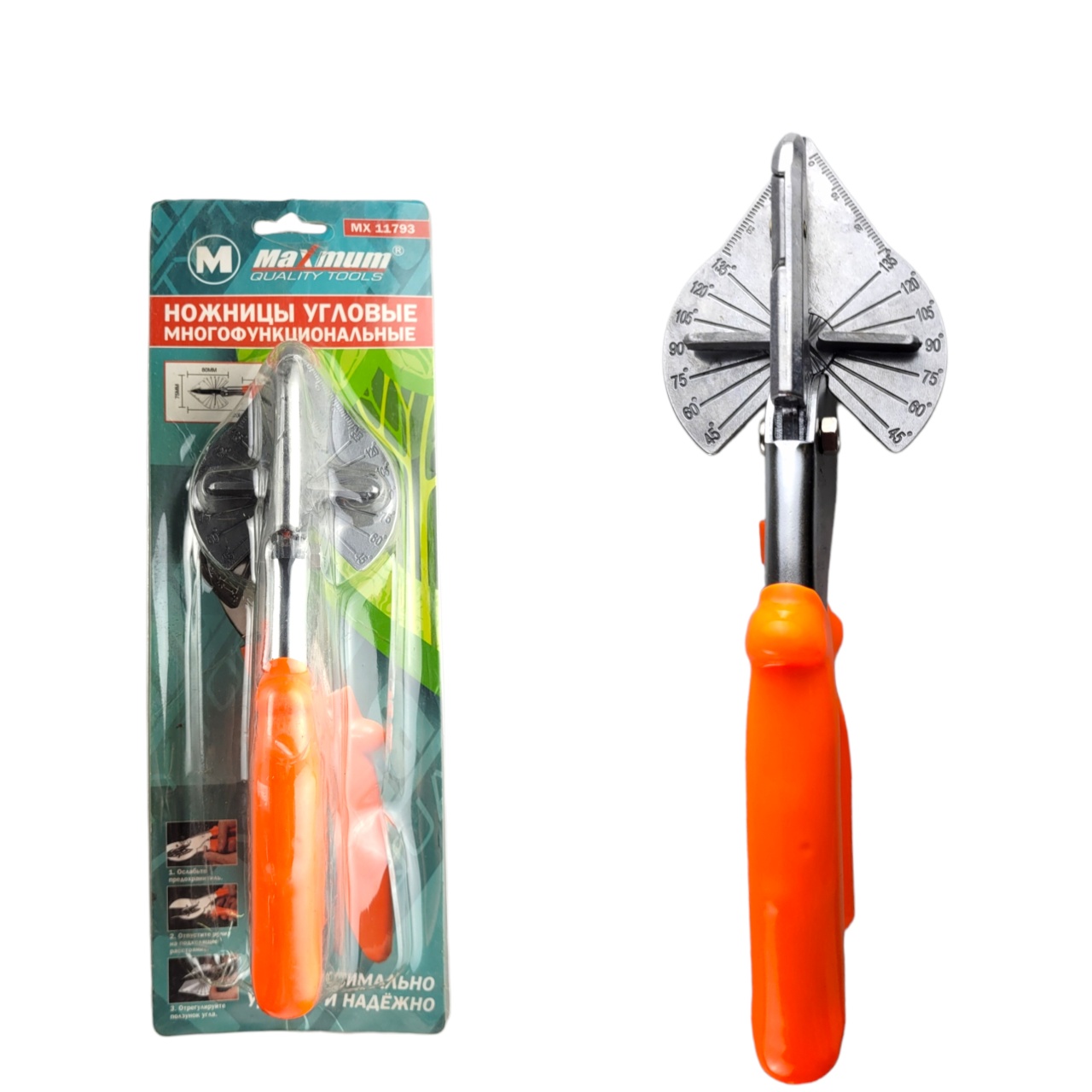 Угловые ножницы со сменным трапецевидным лезвием предназначены для резки пластика, резины, линолеума, картона и тонкого листового металла. Ножницы применяются для резки под заданным углом для дальнейшей точной стыковки в рабочей зоне. Угол реза корректируется перемещением направляющей планки и фиксируется под углом с шагом 15 градусов. Строительные ножницы 220 мм. оборудованы опорой с вмонтированным угольником для резки от 45° до 135° градусов. Специальный замок обеспечивает надежное хранение хранение инструмента. Рукоятки с упорами для пальцев имеют мягкое резиновое покрытие.