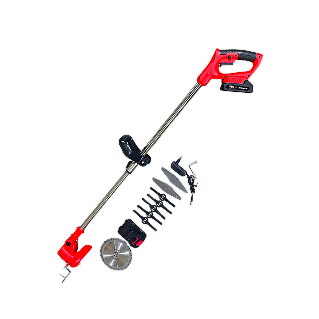 В комплекте стальной диск для веток, алюминиевые и пластиковые лезвия для травы.