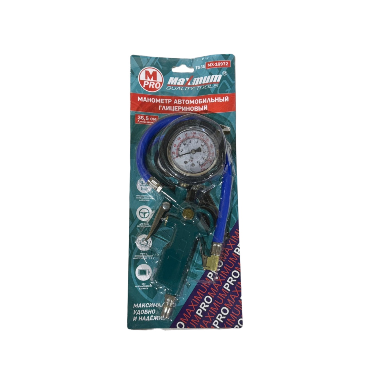 Пневматический пистолет оснащен кнопкой стравливания воздуха и манометром с двойной шкалой, что дает возможность контролировать давление в шинах во время подкачки. Пистолет имеет гибкий шланг 36,5 см, который позволяет производить работы в узких и труднодоступных местах. Отличная ударостойкость благодаря легкому алюминиевому прорезиненному корпусу.