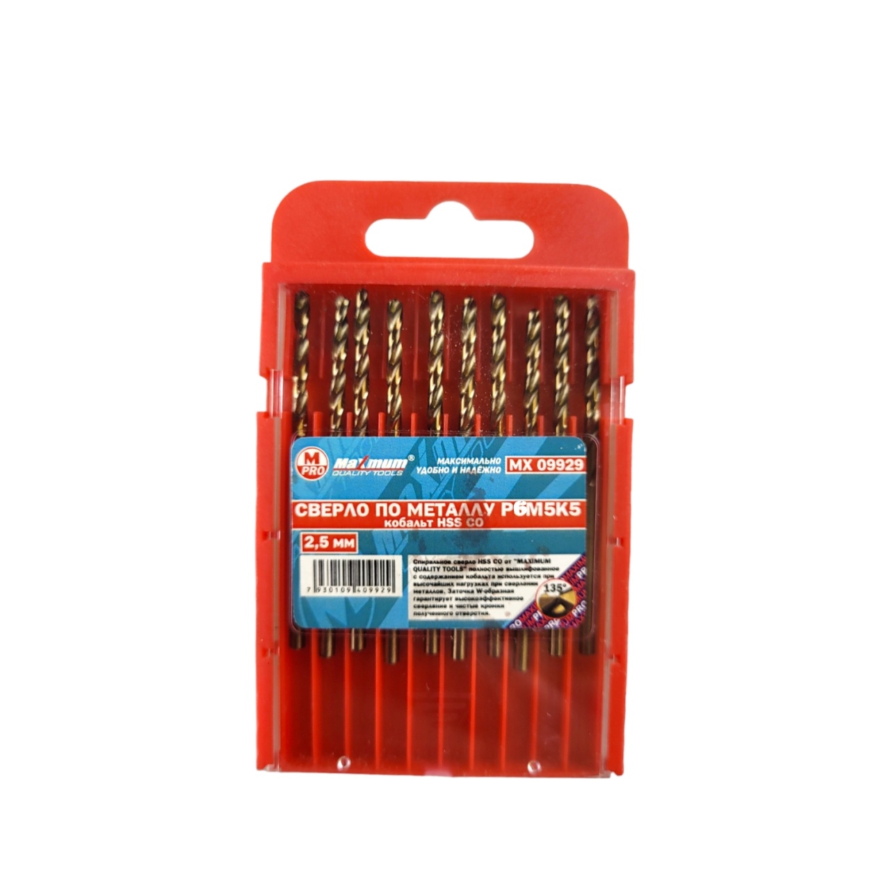 Сверло HSS Co для шуруповерта по металлу 2,5 мм произведено из стали Р6М5К5 с добавлением кобальта и имеет общую длину 55 мм. Набор кобальтовых сверл 2.5 мм по металлу применяется для сверления нержавейки, титана, легированных сталей, чугуна, дерева. Угол заточки 135°. Кобальт в составе улучшает прочность и износостойкость.