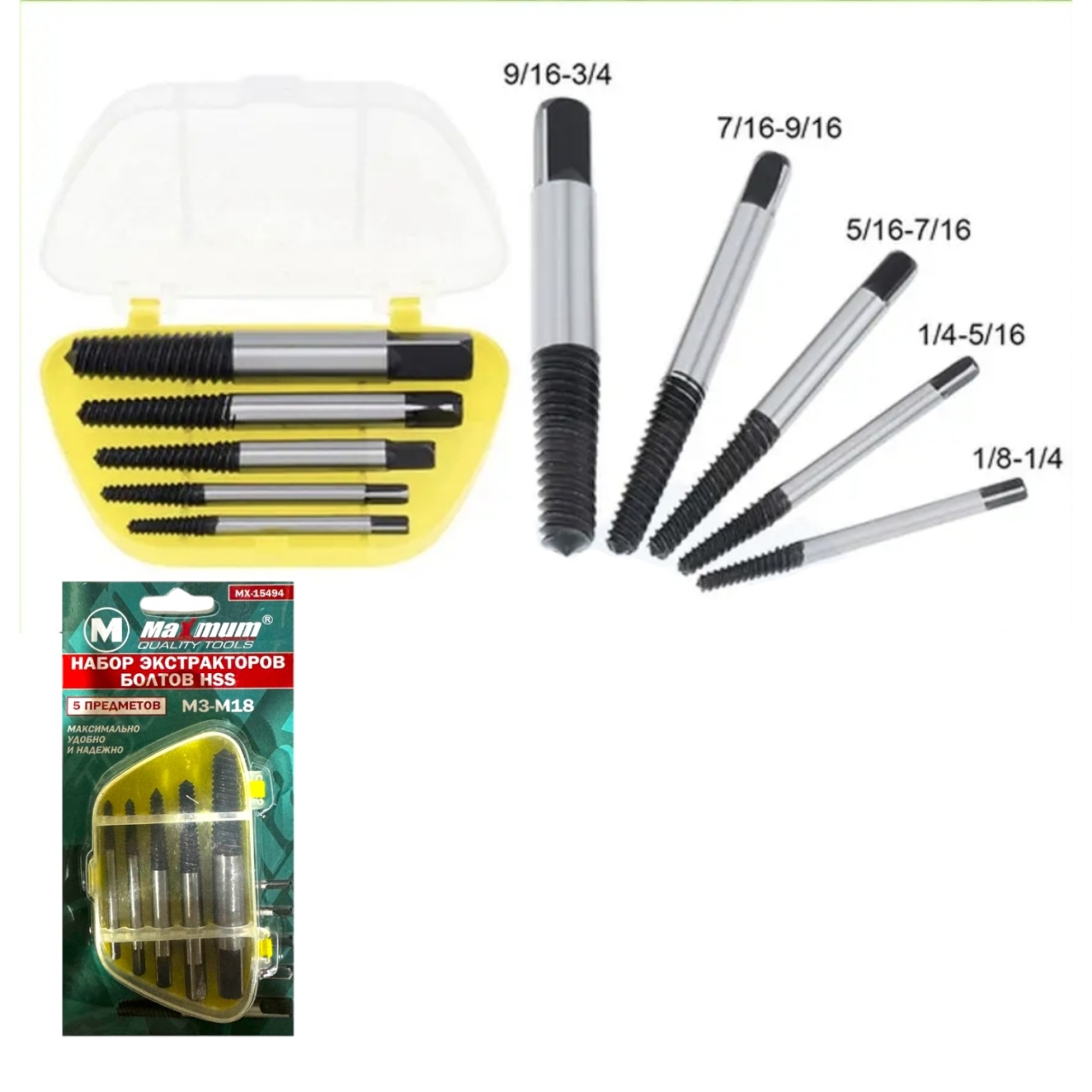 Набор экстракторов болтов HSS, 5 предметов, М3-М18, в пластиковом желтом футляре, "MAXIMUM" MX 15494